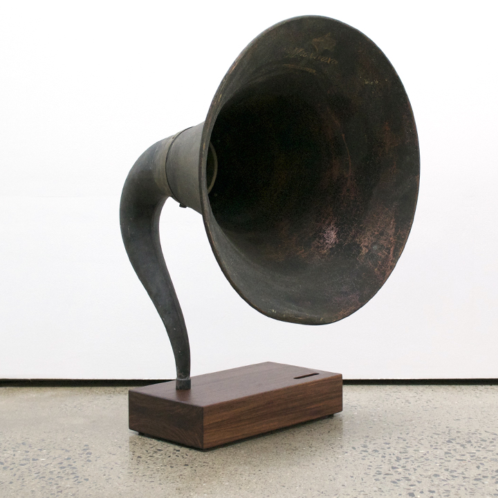 This is the largest iVictrola to date. With the rare, large Magnavox horn, it also has the best fidelity of any iVictrola. These are two-part horns that detach at the bell and have a lovely sound. They still have the old-time sound of a gramophone, but extend the low frequencies just slightly below their smaller counterparts. This iVictrola stands over 20″ tall with an 18″ bell. The base is quite heavy as well.
