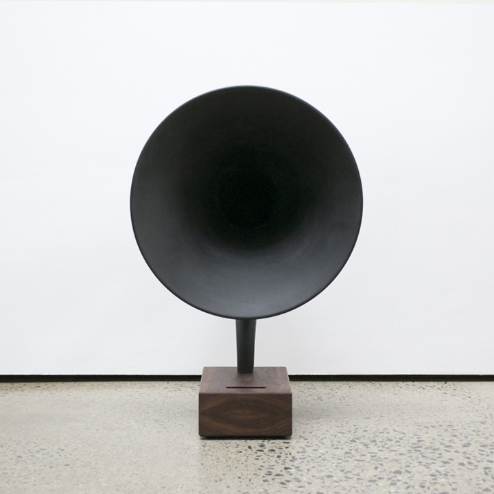 The classic iVictrola form with a metal Rola Recreator horn in excellent condition. This horn may have been repainted at some point and it looks great with the Walnut base. As with most all metal horns, this one has a loud, bright sound.