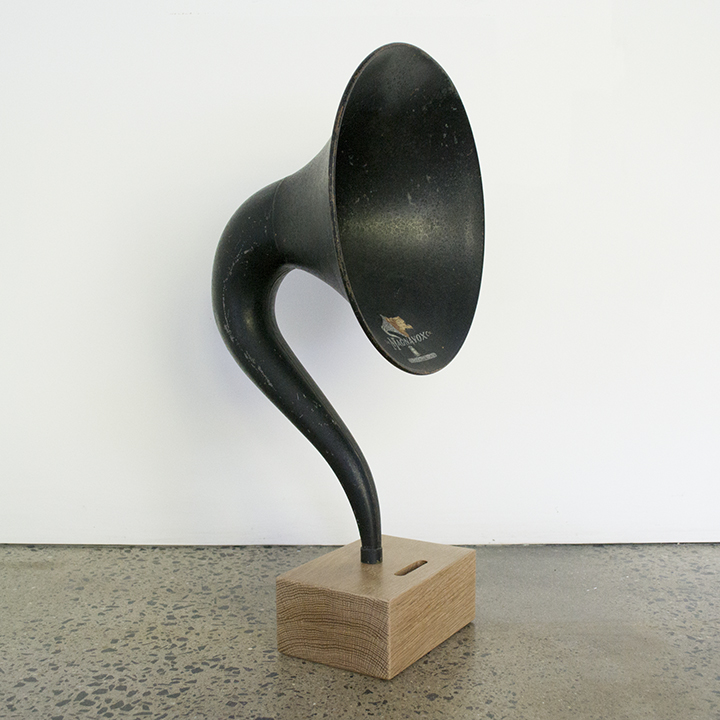 This iVictrola has a heavy White Oak Base and nice condition curved Magnavox horn. It’s sound is bright and is one of the loudest iVictrolas I have built.